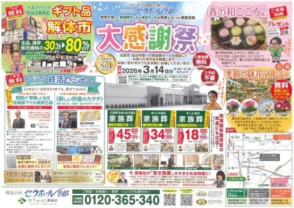 セラホール名取 大感謝祭!3月14日(土)10:00~12:00 セラホール名取にて大感謝祭を開催! ●ご来場プレゼント① 春の和ごころ甘味(お1人よりどりお好きな2個) 春の景色を映し…