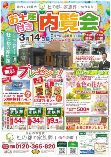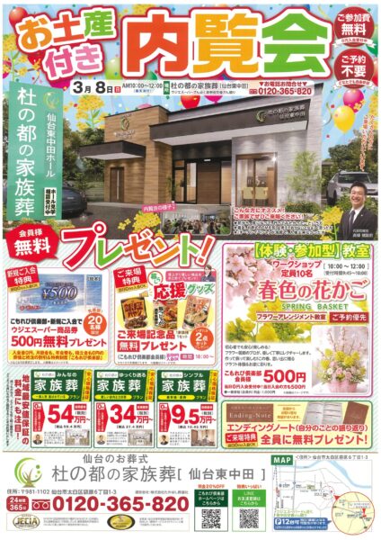 杜の都の家族葬 仙台東中田 お土産付き内覧会3月8日(日)10:00~12:00 お土産付き内覧会を開催! ●ご来場特典を先着順で無料プレゼント! 暮らし応援グッズをご用意しております(1家族様1セット・…