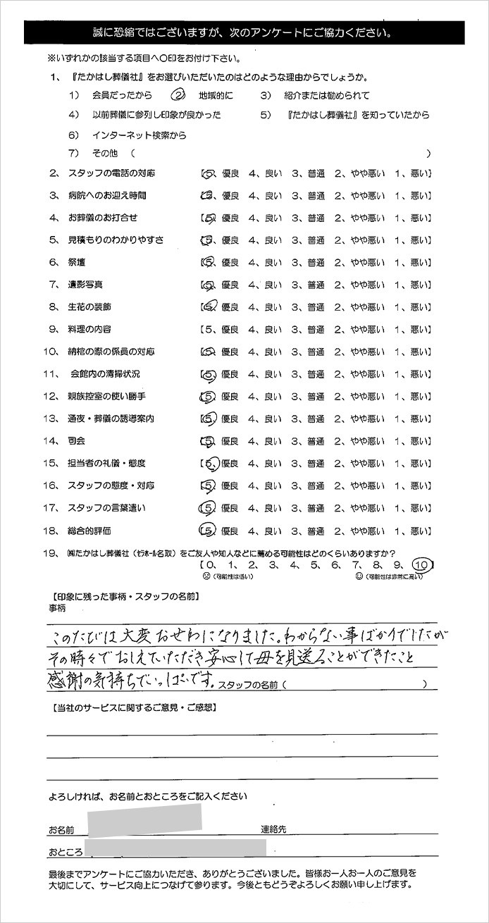 安心して母を見送ることができたこと 2026/01/30 印象に残った事柄 このたびは大変おせわになりました。わからない事ばかりでしたが、その時々でおしえていただき安心して母を見送ることができたこと、感謝の気持ちでいっぱいです。 お客様アンケート